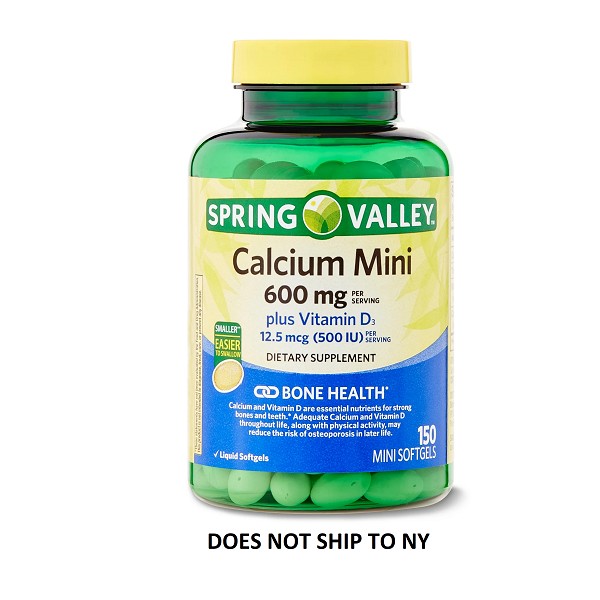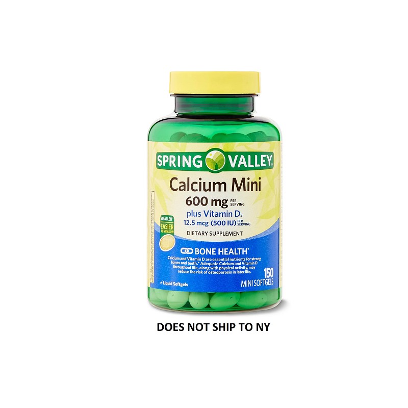 Give your body the support it needs to foster good bone health with our Spring Valley Calcium Mini plus Vitamin D3 Mini Softgels!* Many people don't get enough Calcium and Vitamin D from foods alone. Taking a daily supplement like our Spring Valley Calcium Mini plus Vitamin D3 Mini Softgels capsules is a super convenient way to fill in any dietary gaps for these important nutrients. Adequate calcium and vitamin D as part of a healthful diet, along with physical activity, may reduce the risk of osteoporosis in later life. Calcium is an essential mineral that's well-known for its key role in supporting bone health.* Calcium also helps maintain healthy teeth.* Vitamin D3 is an active form of vitamin D that helps the body absorb calcium and reap its bone-healthy benefits.* Made with your well-being in mind, these mini softgels are free of gluten, yeast, wheat, milk and milk derivatives, lactose, preservatives, and artificial flavor. The mini softgels are also smooth and easy to swallow, and each serving provides 600 mg of calcium and 12.5 mcg (500IU) of Vitamin D for daily health and wellness.* Supplement your healthy lifestyle with Spring Valley Calcium Mini plus Vitamin D3 Mini Softgels 150 per bottle.