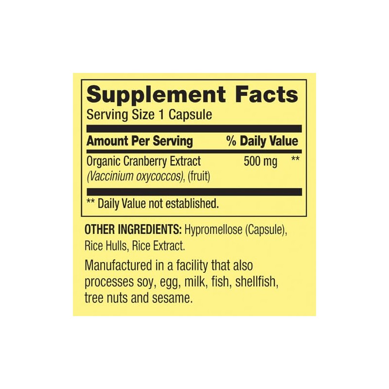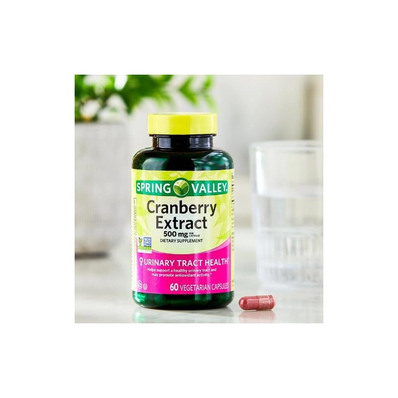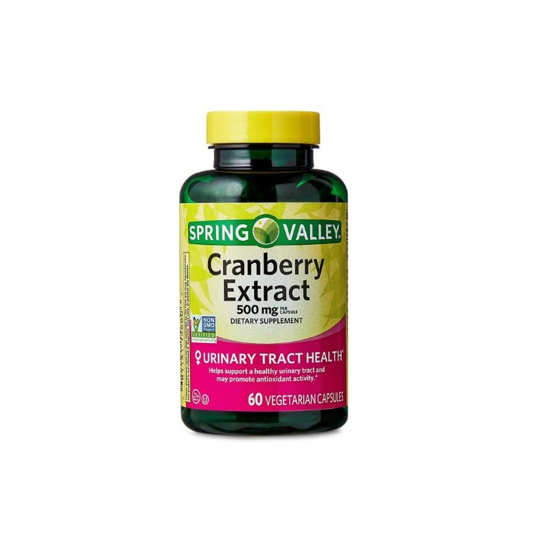 Spring Valley Cranberry Extract Vegetarian Capsules are dietary supplements that promote urinary tract health and may promote antioxidant activity. Each vegetarian capsule contains 500 milligrams of organic cranberry extract. The suggested adult dosage is one capsule daily, preferably with a meal. These capsules are free of gluten, yeast, wheat, milk or milk derivatives, lactose, sugar, soy, and artificial colors and flavors. They contain less than 5 milligrams of sodium per capsule.