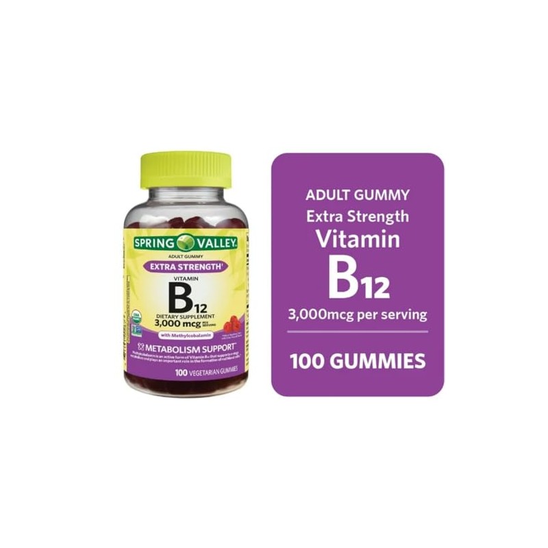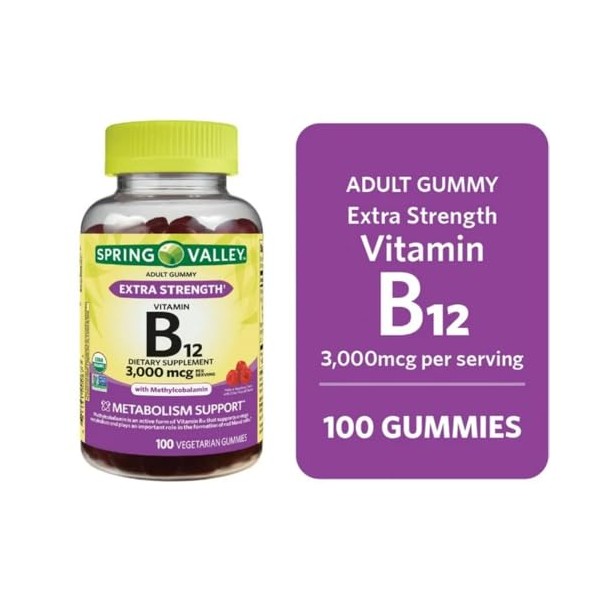 Generic Spring Valley Extra Strength Vitamin B12 Vegetarian Gummies, Raspberry Flavor, 3000mcg, 100 Count