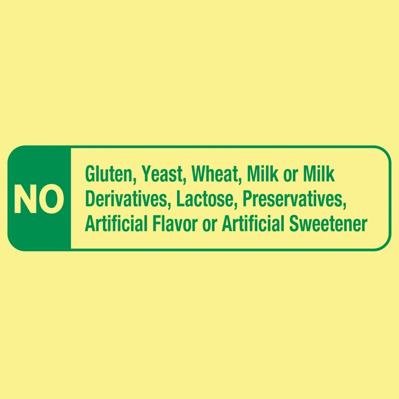 - Contains no gluten, yeast, wheat, milk or milk derivatives, lactose, preservatives, artificial sweeteners, or artificial flavors