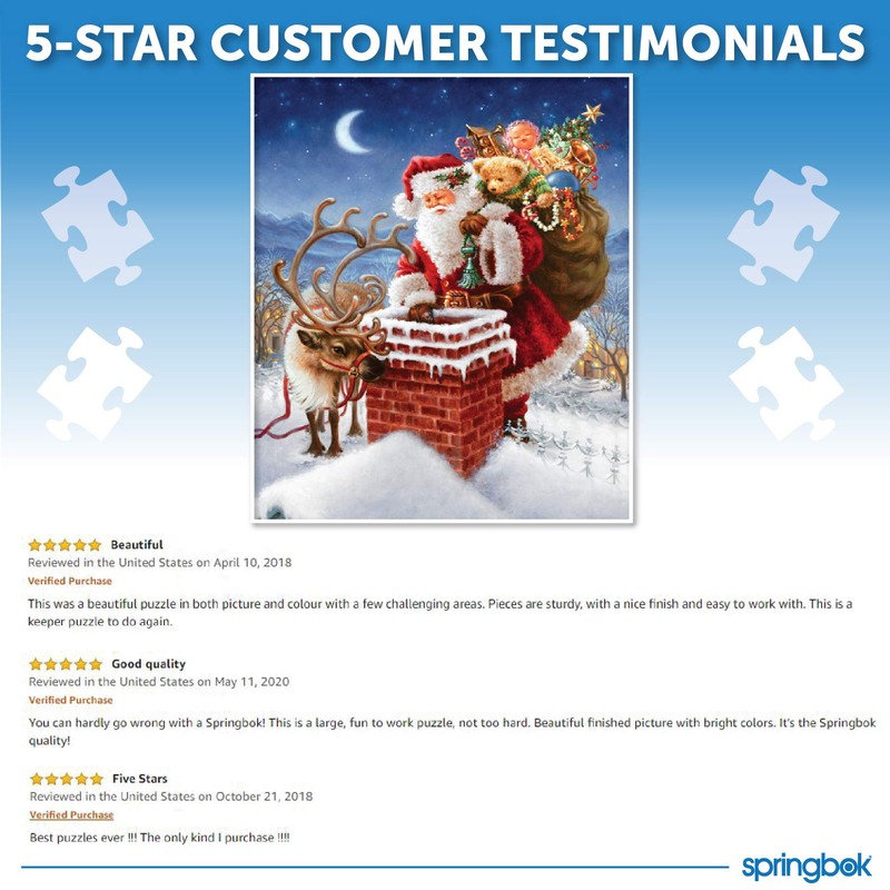 "Santa may be able to fit down the chimney with his special delivery, but Donner will have to stay with the sleigh! Make sure you don't leave any of the toys out while you put together this Christmas puzzle. Exercise Memory - Jigsaw Puzzles sharpen cognitive function. Current neurology experts assert that puzzles stimulate neuroplasticity and can even slow progressive memory loss. Deepen Connections - Conversation flows naturally as your sort and interlock the design. It's like we always say: Love completes the puzzle. Relieve Stress - Escaping into the calm of puzzling for as little as 20 minutes can soothe anxieties. It's the perfect digital detox for you and your loved ones."