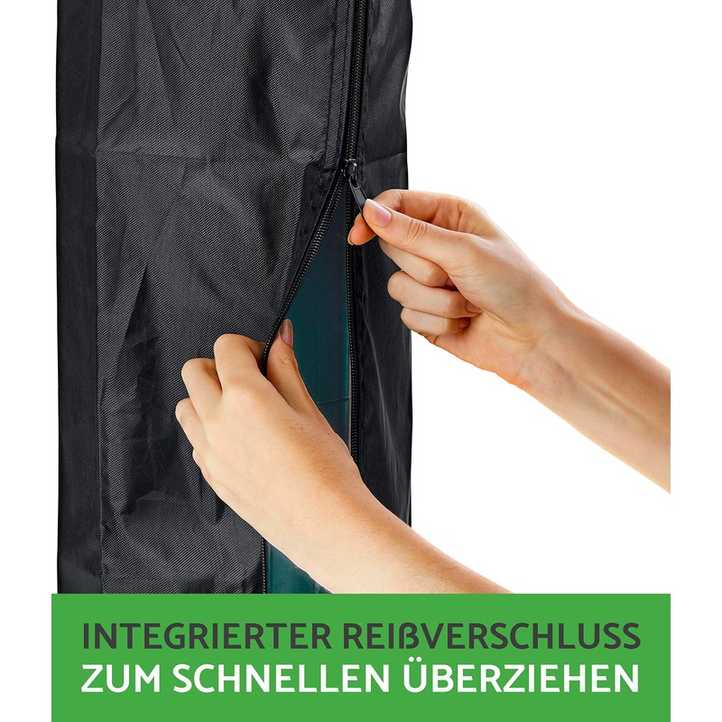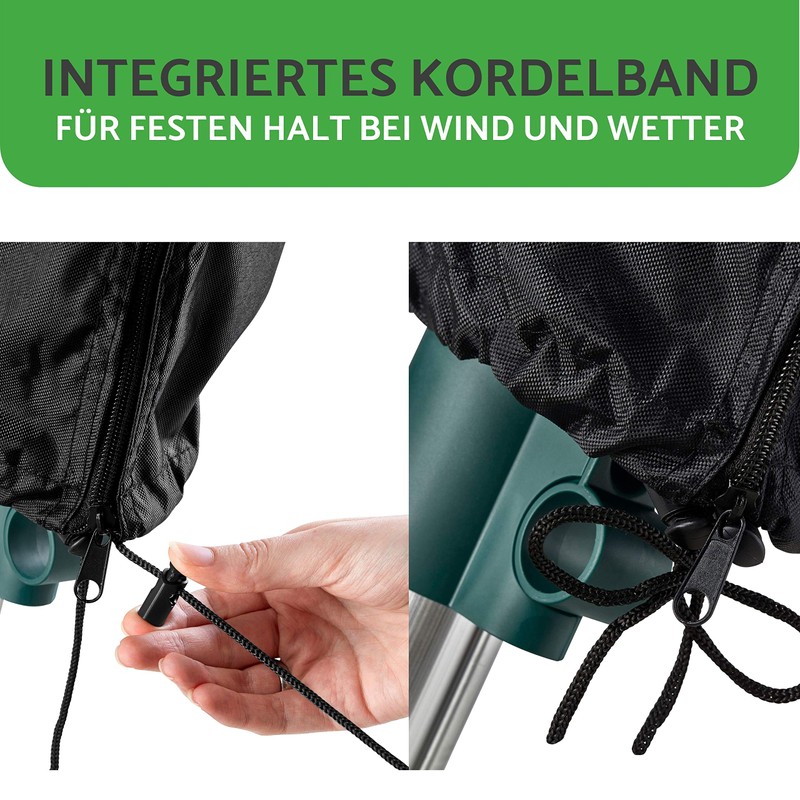 Thanks to the long zip, it is noticeably easy and pleasant to pull the case in standing over the rotary washing line. Thanks to the integrated cord, the cover also withstands strong wind and protects your rotary washing line.