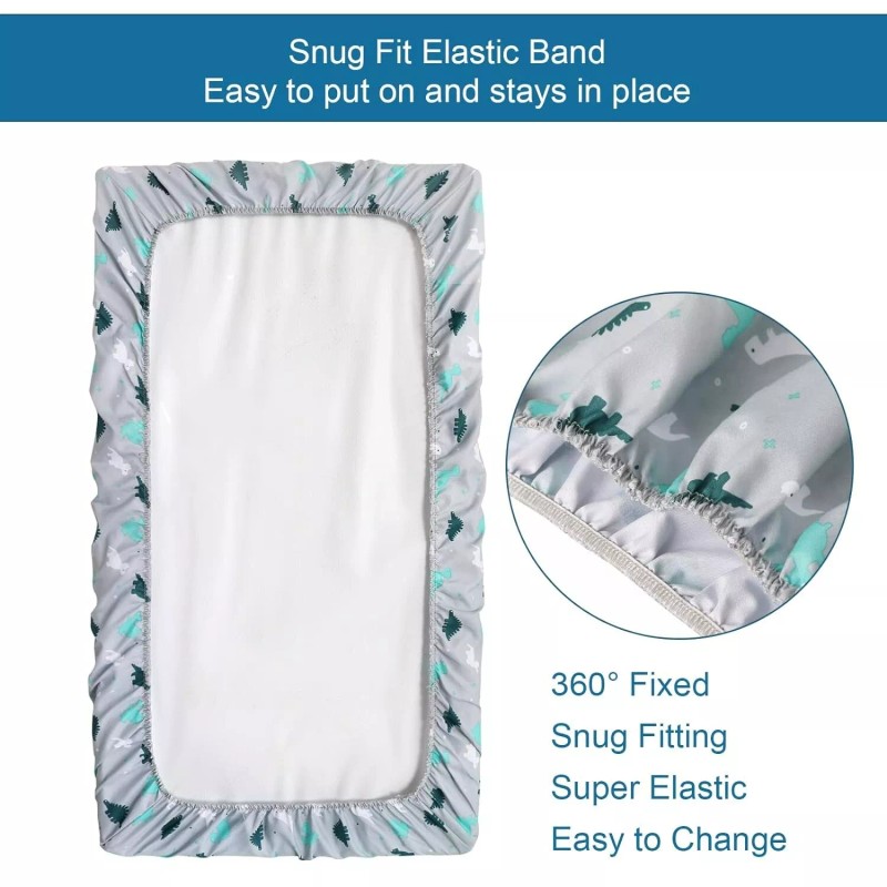 - Super Soft & Quantity Options: These mini crib sheet sets 4 Pack have been carefully selected to be soft and breathable. No matter boy or girl, you can always find the best choice to match your playard bedding. We offer dinosaurs, gray, aqua cute print. True to color. True to size.
