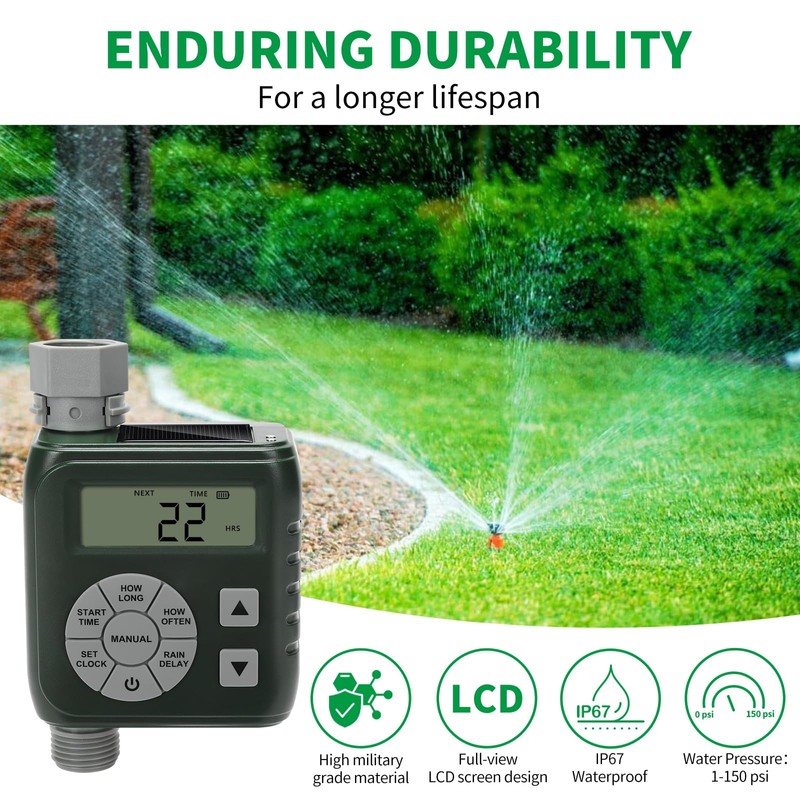Zuomeng Sprinkler Timer, Programmable Irrigation Water Timer for Garden Hose, Solar/Battery Dual Power & Professional Leak-Proof Design, Rain Delay/Auto/Manual Watering System, Green