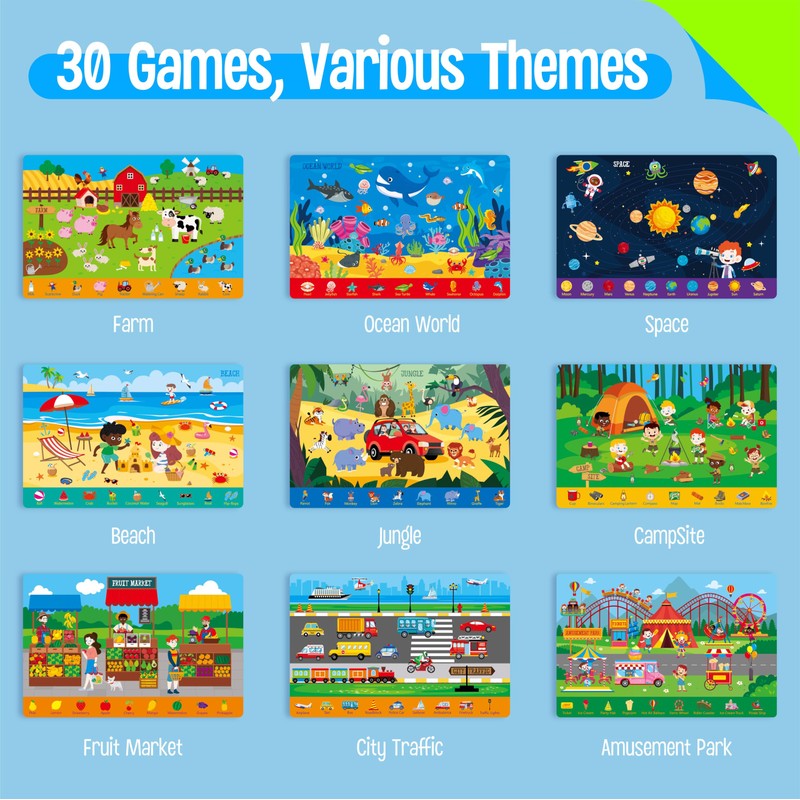- 30 Different Themes: The book contains 30 unique themes for preschoolers to explore, including ocean world, beach, campsite, treasure hunt, occupation, jungle, and more. Each sheet unfolds a richly illustrated theme, from bustling city scenes to enchanting forest settings, encouraging children to dive into a world of engaging visual puzzles.