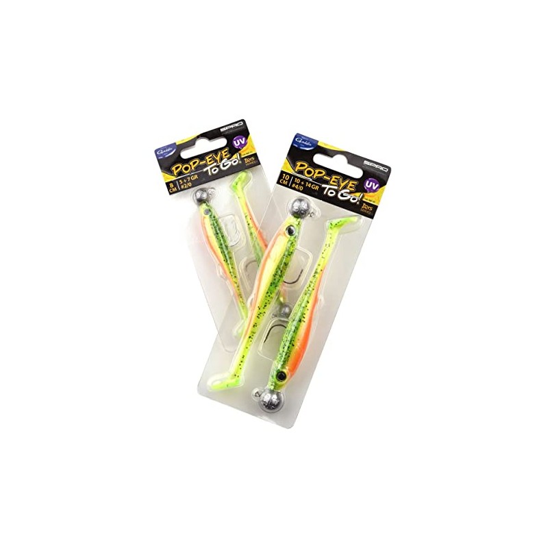 Spro Iris Popeye to-go 8 cm 5 + 7 g - 2 mounted rubber fish - the fishing set from Spro is a faithful companion for rubber fishing for zander and perch. The baits are already pre-assembled, so they can be used directly. The jig hook is very stable and the head is provided with the relevant information about the weight and hook size.