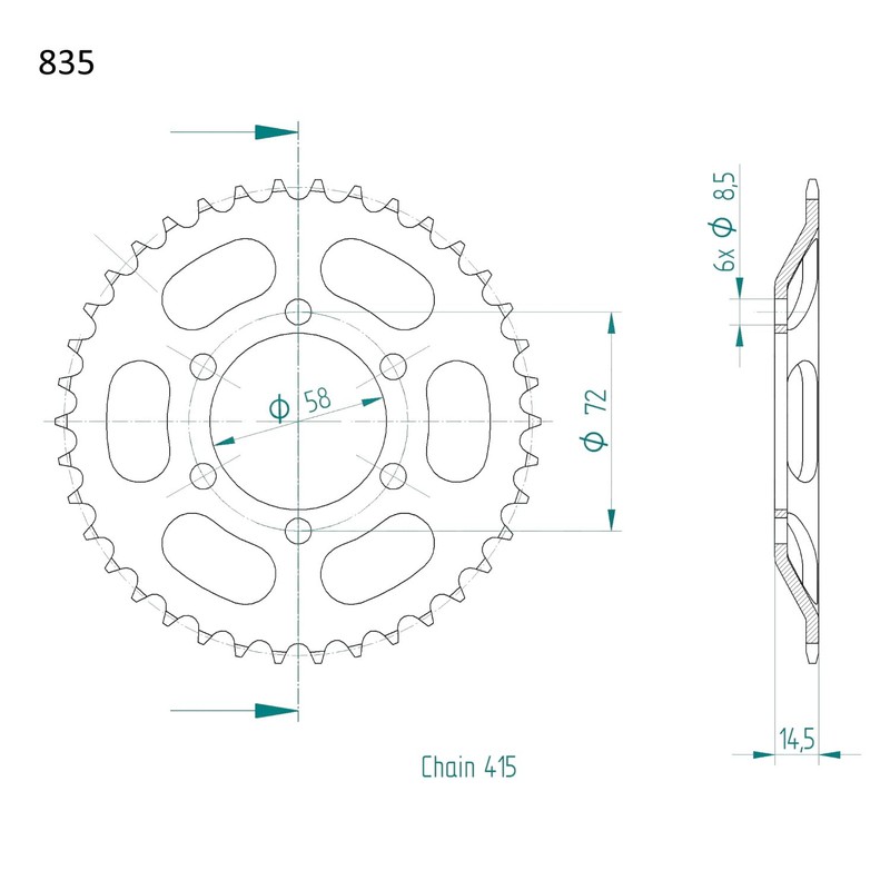 - Number of mounting holes: 6, diameter of mounting holes: 8.30 mm, chain ring thickness: 3/16 inch (4.60 mm), pitch: 415 (1/2 x 3/16 x 7.75), compatible chain link length: 1/2 inch (12.70 mm)