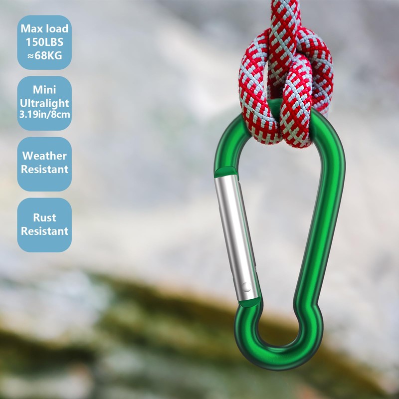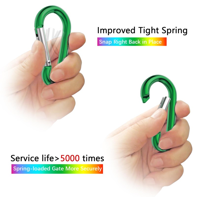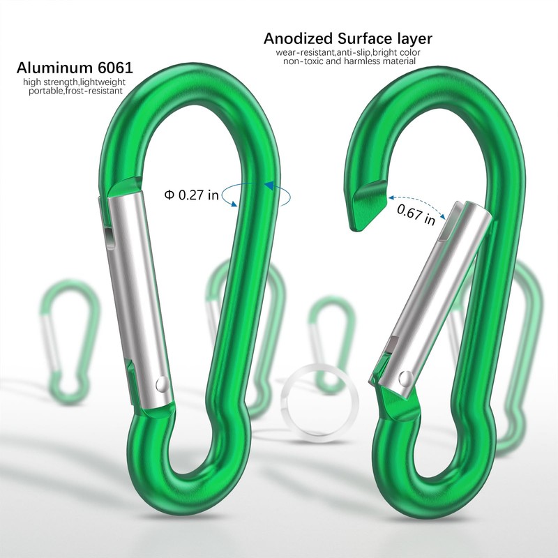 - ✔【Design】- Green Aluminum Caribeener Clips, Silver Steel Ring. Spring-Loaded Closing Gate Makes it smoothly to open and close. Coloring through an oxidation process, which makes it very difficult to fade/rust, except scratching