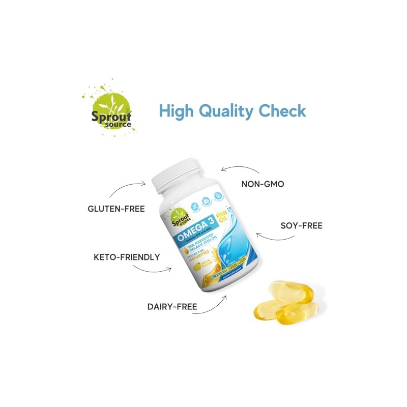Sprout Source- “Aceite de Pescado Omega3 Pelágico Cosechado en el Mar para la Salud del Corazón, los Ojos y el Apoyo Articular 1200mg, 90 Días S