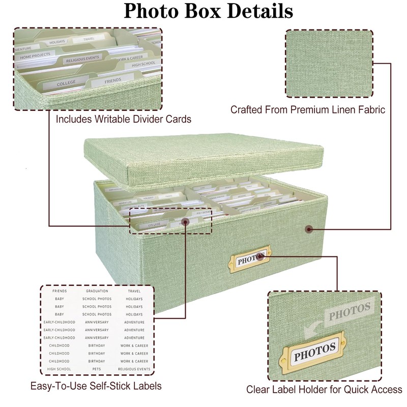 - 2. Durable & Dustproof-Resistant & Acid Free: Crafted from premium linen and reinforced hollow board, this picture organizer box resists deformation and offers lightweight dustproof. The minimalist design, complete with a sleek handle and labels, adds elegance to any space