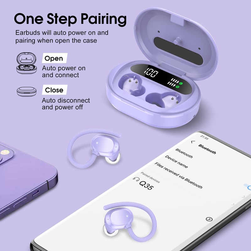 - [Dual LED Digital Display and Fast Charging]: Q35 wireless earbuds show the remaining charge level of the charging case by the number on the charging case screen, and the charging status of each earbud by the LED light bar. The charging case has a built-in 400mAh battery, and two fully charged headphones can get up to 5 hours of music playback time. The charging case can charge the dual sport earbuds 5 times for a total of 30 hours of music playback, and supports Type-C fast charging.