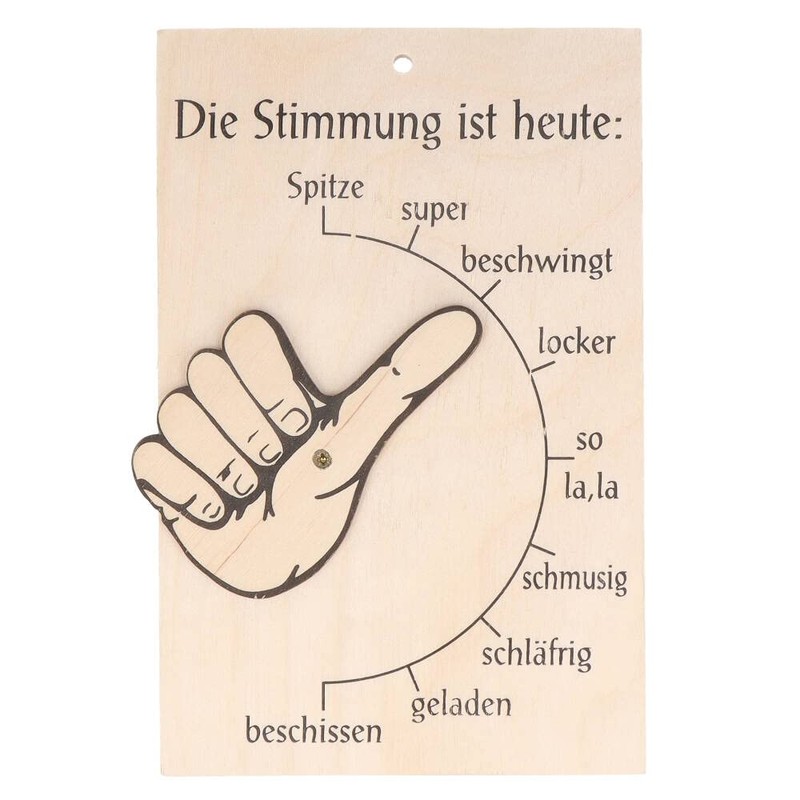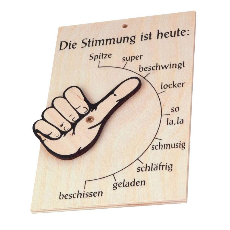 - Mood barometer: Fun wooden mood barometer to show your mood. With this mood indicator, you can show your family, friends or colleagues what mood you're in. Simply turn the thumb of this door sign to the current mood.