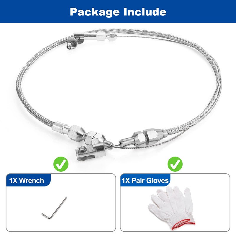 - Braided Cable Package: The throttle cable kit includes 1x 24 in throttle cable, 1x wrench, 1x user manual, and 1x pair of gloves. Let it be easy to replace the throttle cable ferrule and throttle cable bracket.