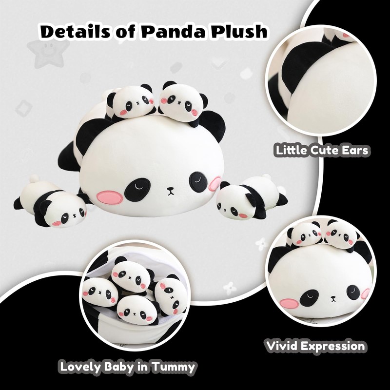 SQEQE Panda Stuffed Animals with 4 Baby Panda Plushies in Her Tummy, Cute Plush Pillow Cartoon Hugging Toy Gifts for Kids/Toddler/Baby