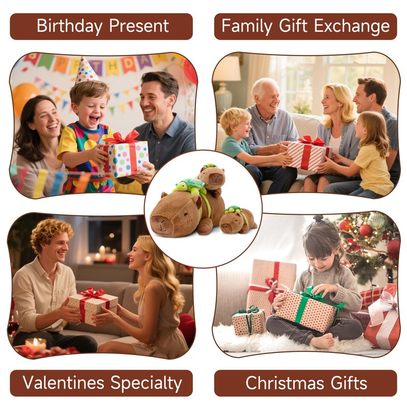 - [Meet Your New Playmate] This soft capybara plush features a lifelike smile and a tiny turtle companion on its back. 2-in-1 Fun: The tiny turtle isn’t just a backpack; its adjustable strap lets your capybara stuffed animal wear it as a hat for a goofy look or snugly on its back for classic cuteness. Perfect for kids who love mix-and-match toys or adults craving a whimsical desk buddy!