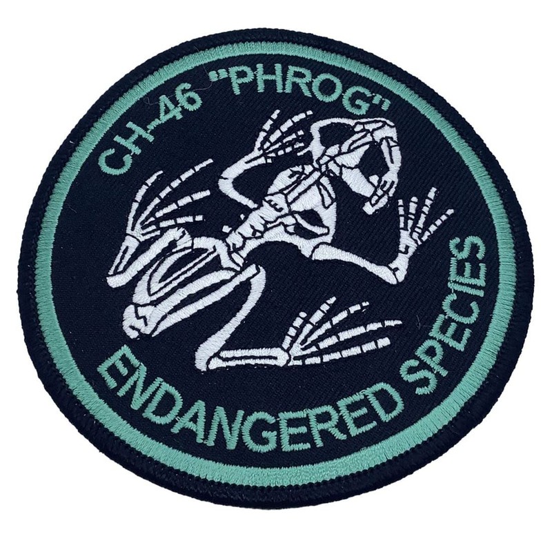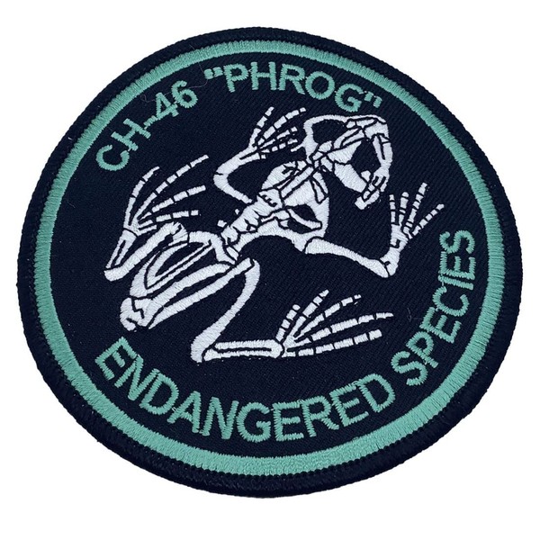 Marines and Aviators! Enjoy this beautifully embroidered CH-46 Endangered Species patch. This is a great tribute patch to the legendary Phrog.