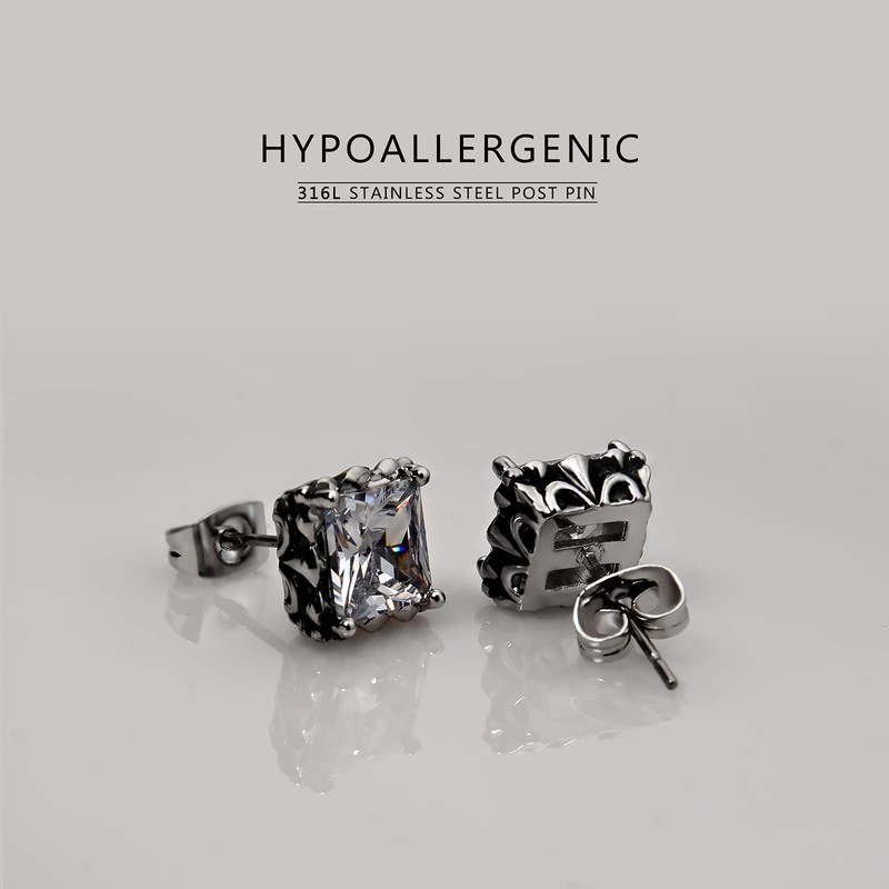 Square Earrings for Men, Hypoallergenic Black Stud Earrings for Women Retro Stainless Steel Earrings Cubic Zirconia male earrings