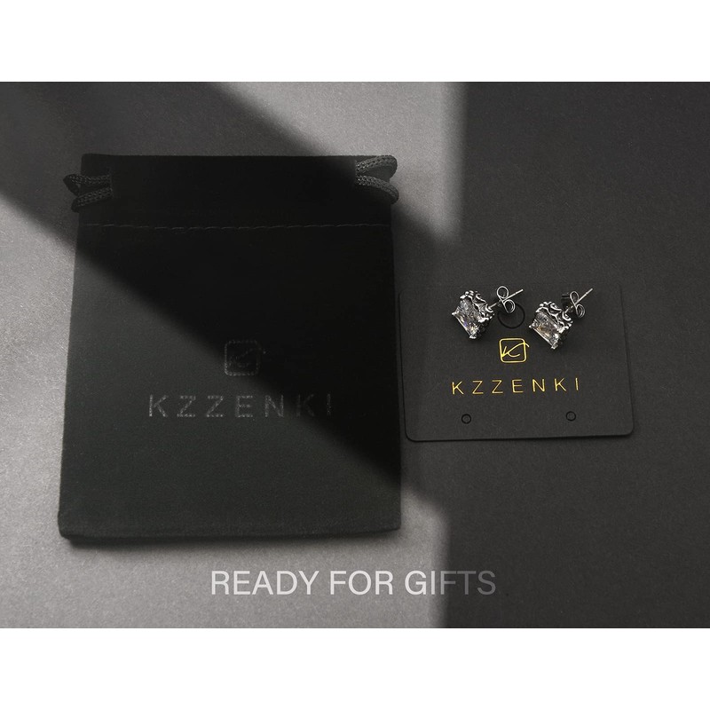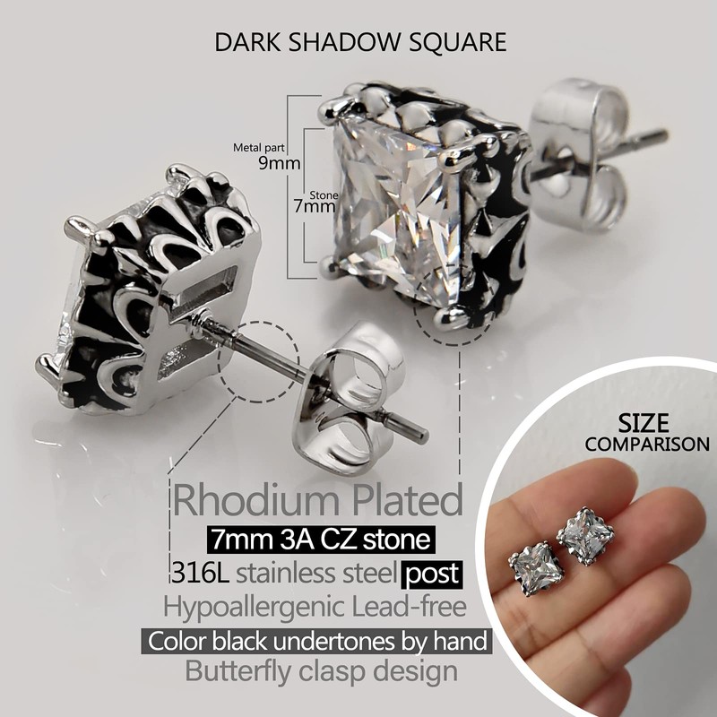 - HIGH QUALITY INLAID - The black studs main part: 7MM AAA+ princess cut Cubic Zirconia Stones/ Wide 9MM environment solid brass base/ Electroplated rhodium. CZ stud earrings are an affordable diamond earrings studs alternative that reveals brilliant shine and a meticulous cut