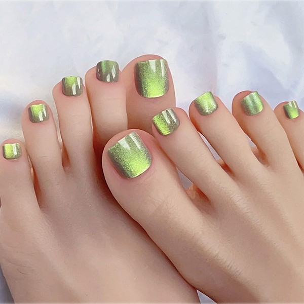 Square Fake Toenails Cat Eyes Press On Toenails Short Green False Toe Nails With Glossy Designs Acrylic Toenails Cat Eyes Glue On Toenails Short Full Cover Stick On Toenails For Women