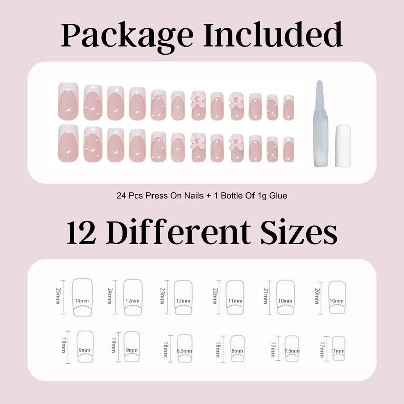 • 【Pink French Design】This elegant touch nails is designed in a lovely pink French style, and each piece of french tip false nails is decorated with delicate pink bows and pearls, adding a touch of elegance and sweetness to your fingertips, which is suitable for everyone