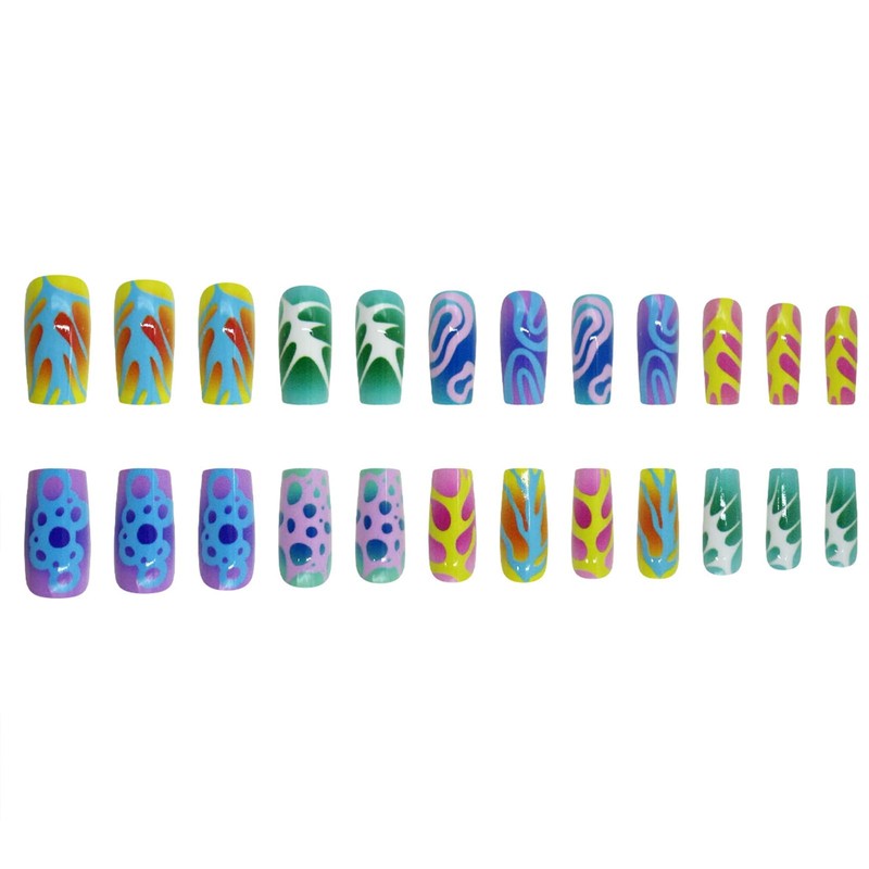 Square Press on Nails Medium Fake Nails with Designs Lines Stick on Nails Colorful False Nails Acrylic Nails Reusable Artificial Nails Press ons Glossy Full Cover Glue on Nails for Women 24Pcs