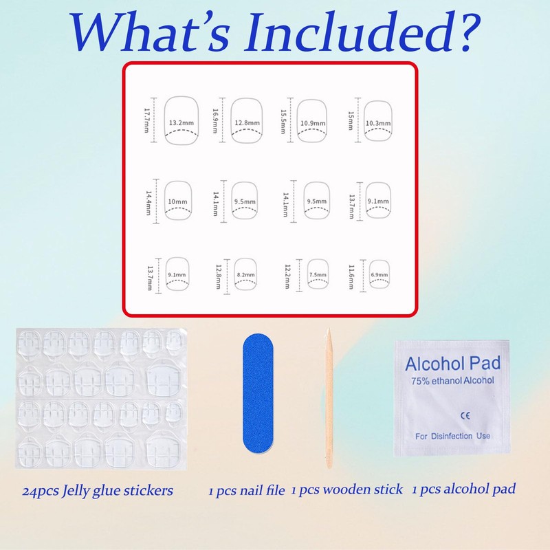 - 【Package Included】you will get 24pcs press on nails,1pcs jelly glue stickers,1pcs alcohol pad,1 nail file, 1 wooden stick.