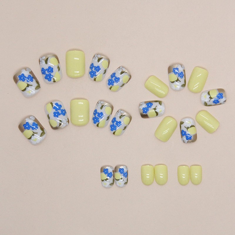 Square Press on Nails Short Fake Nails with Flower & Lemon Designs Glossy Glue on Nails Summer Acrylic Nails Cute False Nails Yellow Full Cover Artificial Stick on Nails for Women 24Pcs