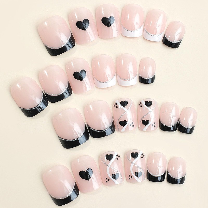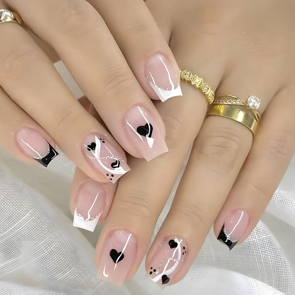Square Press on Nails Short Fake Nails with Heart Glitter Lines Design False Nails Black White French Tip Nails Press ons Glossy Acrylic Glue on Nails for Girls 24Pcs