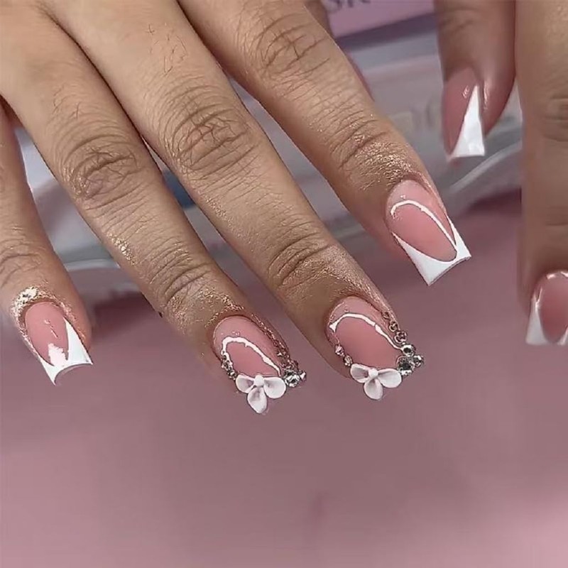 - Easy to Use: These floral fake nails is simple and easy to use, after trimming and cleaning your nails, then choose a white french tip false nails that is suitable for your own nail size, apply with glue, then press the cute false nails onto the jelly glue you will get the nails art you like