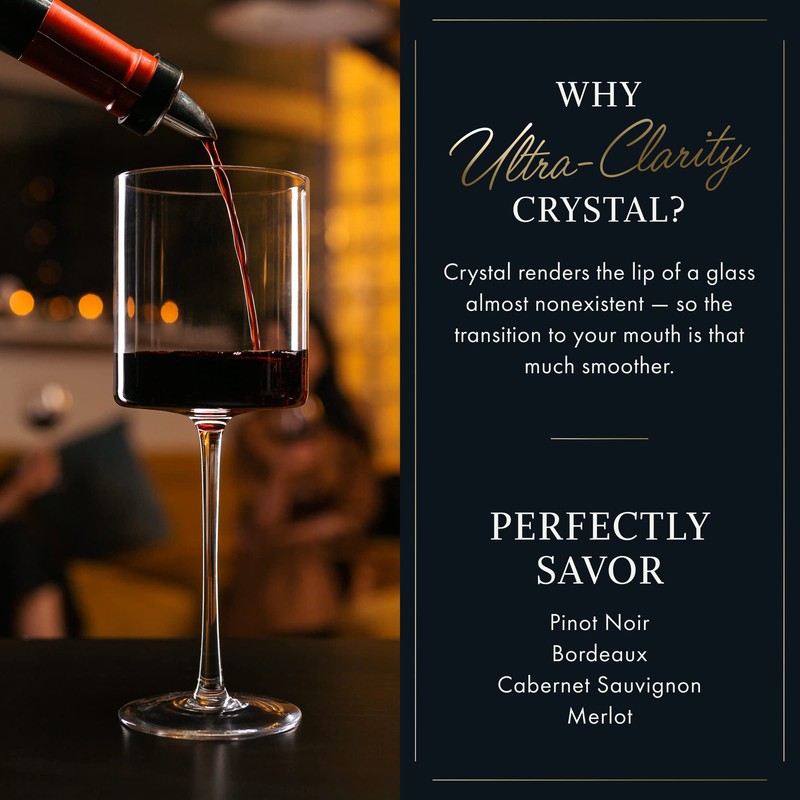 - ✔ 100% Lead Free Crystal – Unlike other wine glasses which contain at least 20% lead, Elixir Glassware is made from 100% lead free ultra-clarity crystal. All the wonderful sparkle and flair of fine crystal glass stemware, tempered for durability and carefully crafted to perfectly savor Pinot Noir, Bordeaux, Cabernet Sauvignon, or Burgundy.