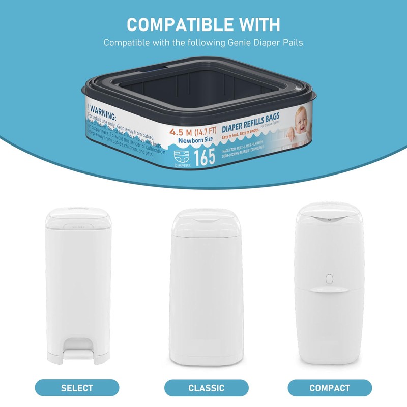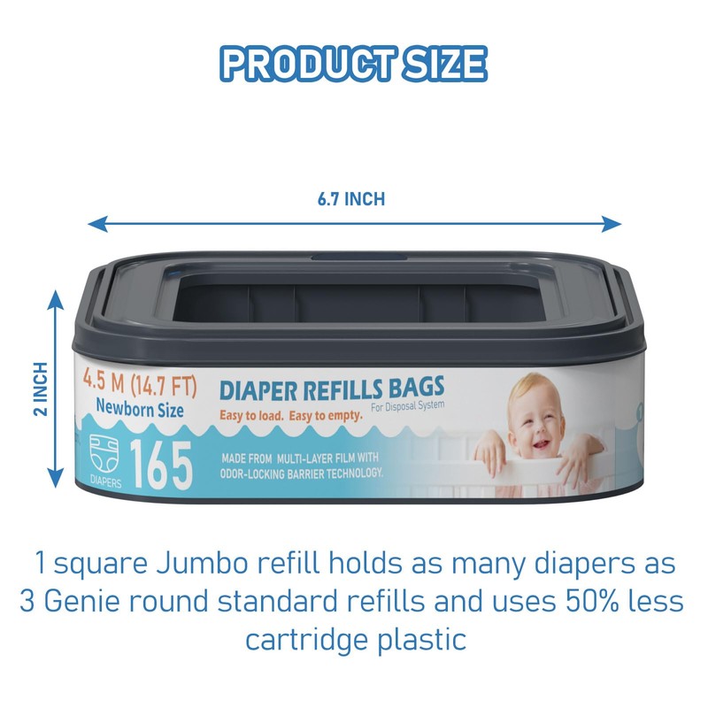 • Perfect Compatibility: These Square Starter Refills Disposal Bags Refill Compatible with Diaper Genie Compact and Select Pails (Not Fit Classic Version Pails). One Jumbo Square refill cartridge supplies 165 newborn diapers!