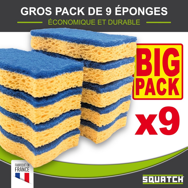 SQUATCH® Soft | Pack of 9 Kitchen Sponges | Big Pack Economy Pack | Scratch-Resistant Abrasive | Vegetable Cellulose for Cleaning, Blue Side for Delicate Tableware | Double Action & Ultra Absorbent