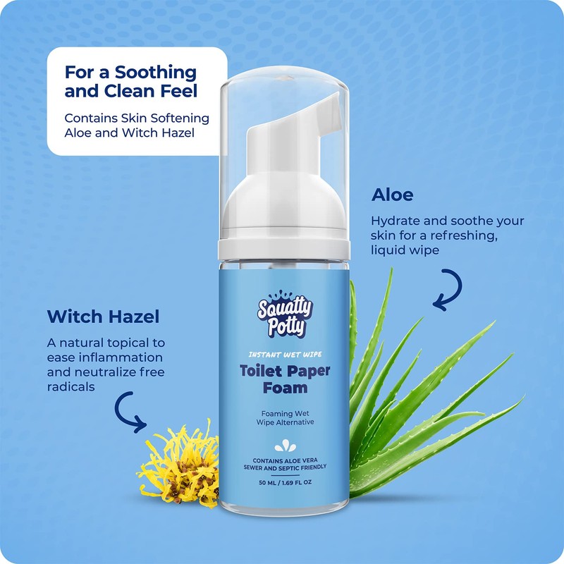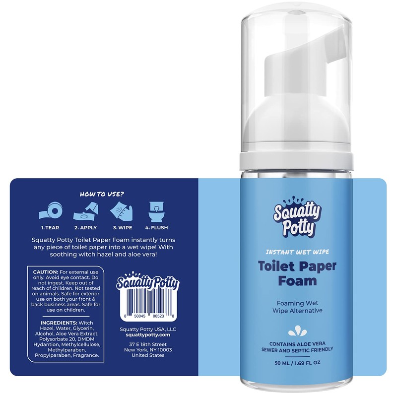 - Use Squatty Potty tissue paper foam for an instant, environmentally friendly wet wipe for use in your home, on the go, and during outdoor activities like hiking, camping, and hunting