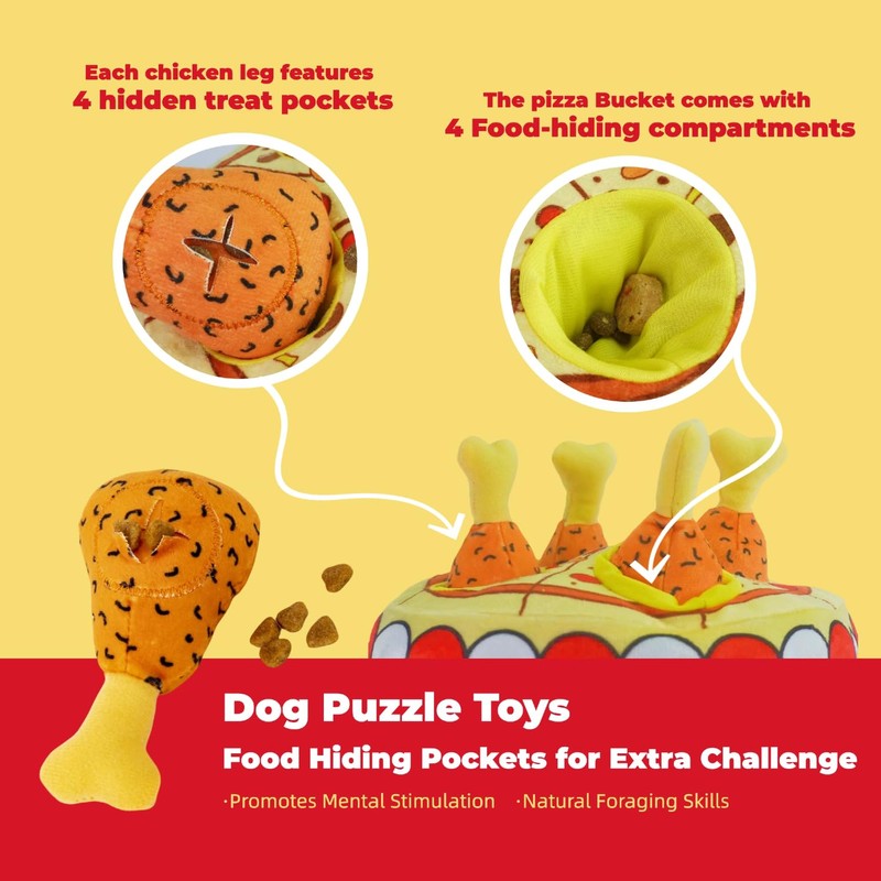 - Interactive Hide & Seek Play Challenge your dog's mind and instincts by hiding the chicken legs in the pizza bucket. Let them sniff, dig, and find the hidden treasures, offering both entertainment and cognitive stimulation.