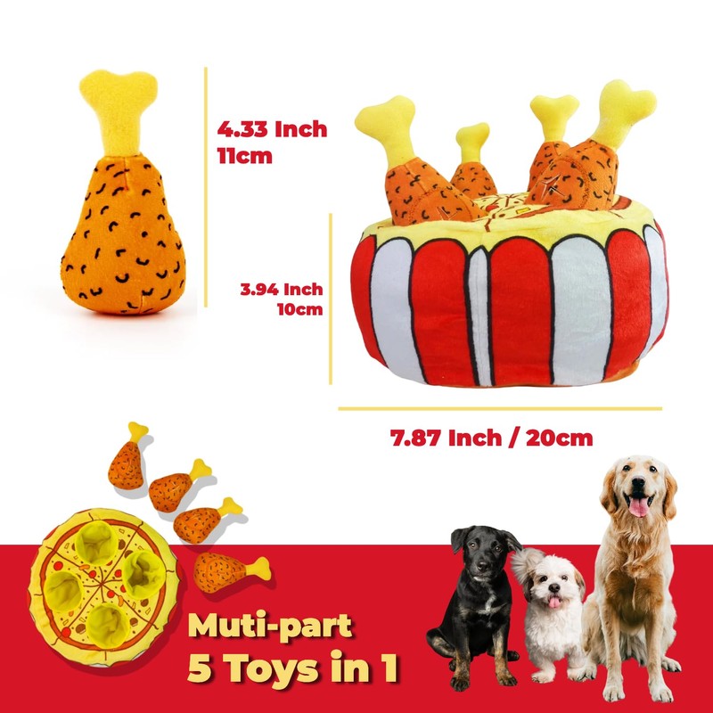 - Food Hiding Pockets for Extra Challenge Add to the fun by hiding treats inside the chicken legs' pockets and the 4 holes in the pizza bucket. This feature helps stimulate your dog's natural foraging instincts, making it a great puzzle toy for mental exercise.