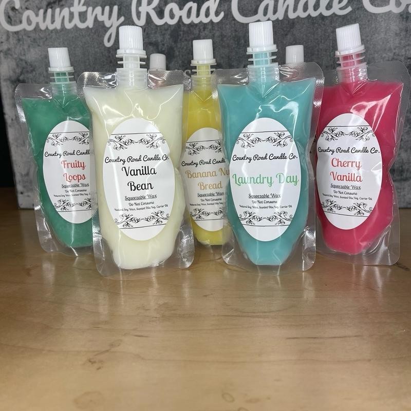 *Squeeze wax consistency will vary from pouch to pouch due to different viscosities of each oil and also the time from which the pouch was poured, as Soy Wax continues to harden over time. This will not affect strength nor throw of the scent.