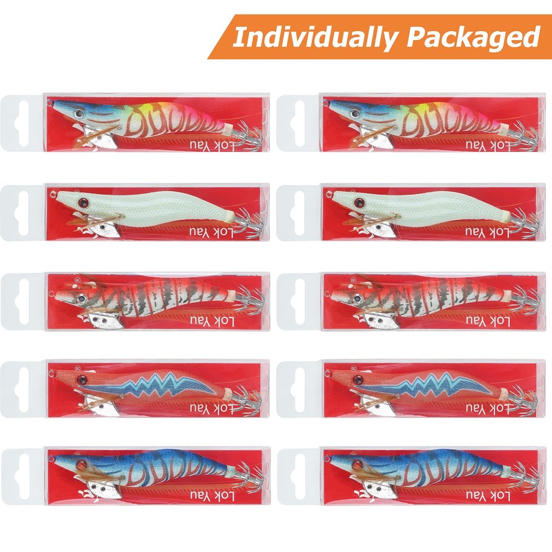 • COLORFUL SQUID JIG: 10pcs/lot brightly colored squid jig body have a stainless steel sharp double squid hooks with 12 claws for long-term use. Super Durable, corrosion resistance.