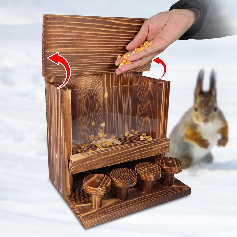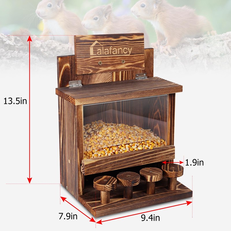 - Large Squirrel Feeding House: Dimensions: 15.2"L x 8.6"W x 8.3"H. Enlarged 4 chairs (1.9 inch diameter) are more convenient for squirrels to stand. Cute design with "The Nut Bar". The lid comes pre installed, the hinged top for easy filling.