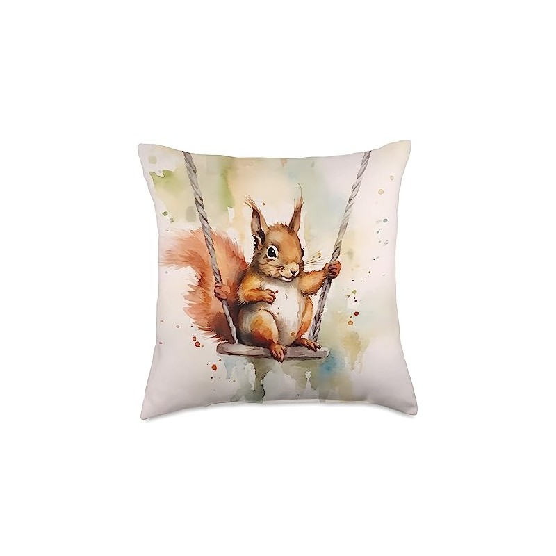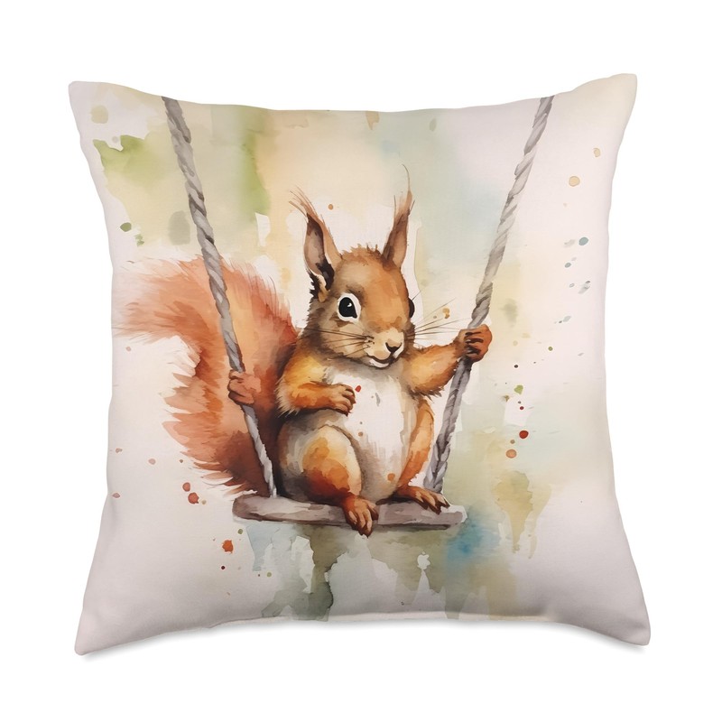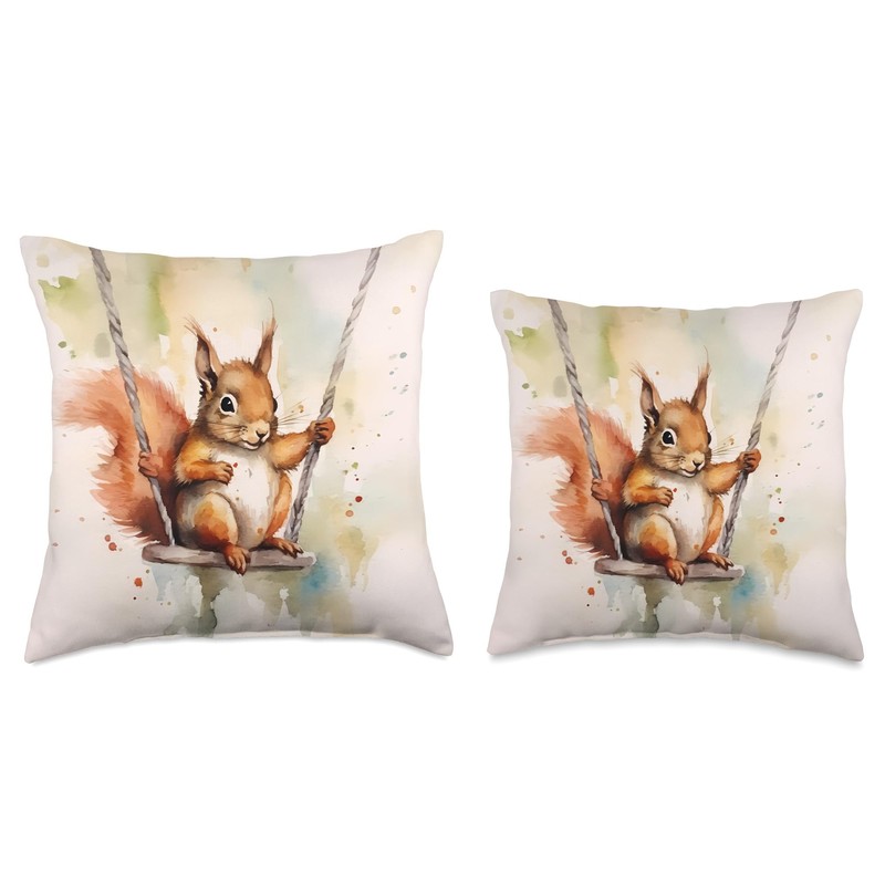 Squirrel Having Fun On Swing In Tree Play Squirrel Playing On Tree Swing Throw Pillow, 18x18, Multicolor