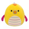 • Adorable Plush Toy: This charming stuffed animal features a bright yellow design with cute details like black dot eyes and a striped egg-shaped belly.