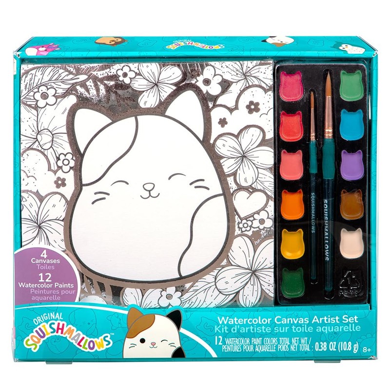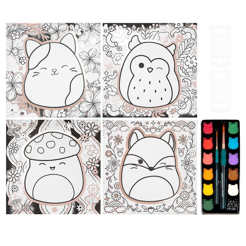 - Color in your masterpiece with this Squishmallows Watercolor Paint & Canvas Set. Each canvas in this set depicts a ready to be painted character and background with rose gold foil accents. Included in the set is a helpful instruction pamphlet that introduces painting techniques, color mixing, and color theory. Use this kit for a fun family activity, or practice painting on all four canvases yourself!