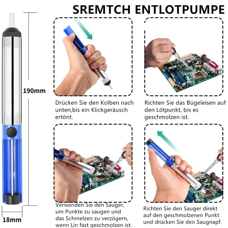 - 15 in 1 soldering kit: certified SREMTCH soldering iron kit contains instructions for use. Includes: soldering iron, desoldering pump, 5 soldering iron tips, tin tube, soldering iron holder, tweezers, suction sponge, wire stripper, 2 electronic wires and PU handbag. The design of the blue PU bag is stylish, so you can take it with you and find the tools you need in your handbag. Very suitable for beginners, welders, household basic equipment, welding technician training.