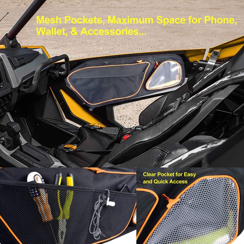 - EASY TO INSTALL AND CLEAN:These rzr pro xp side door bags can easily be installed on the driver and passenger doors of the front door,it is only necessary to fix the supplied mounting screws in the corresponding position.Inside and outside of the rzr pro xp left and right side bag door bags are made of waterproof smooth material, even if you cross mud or swamps and it is very easy to clean and only need to wipe with a damp cloth.