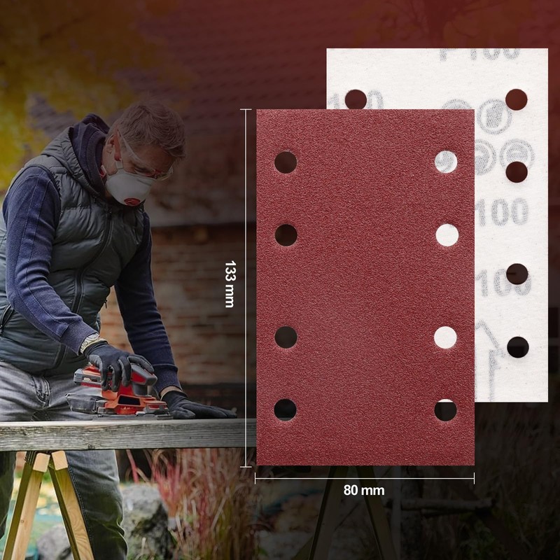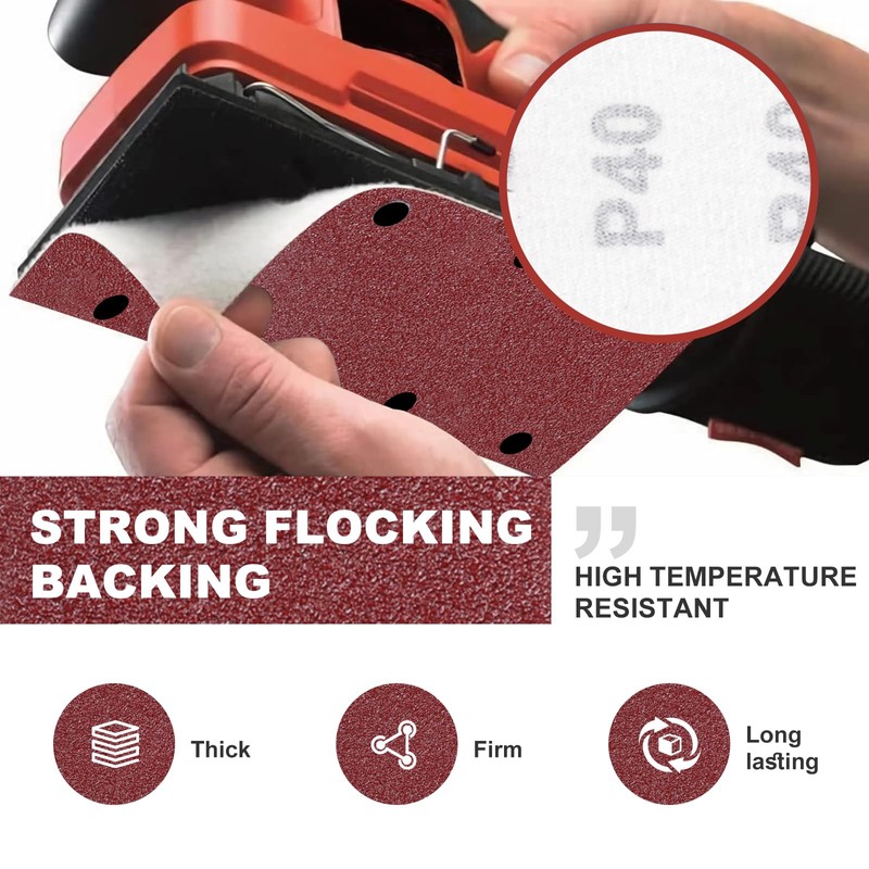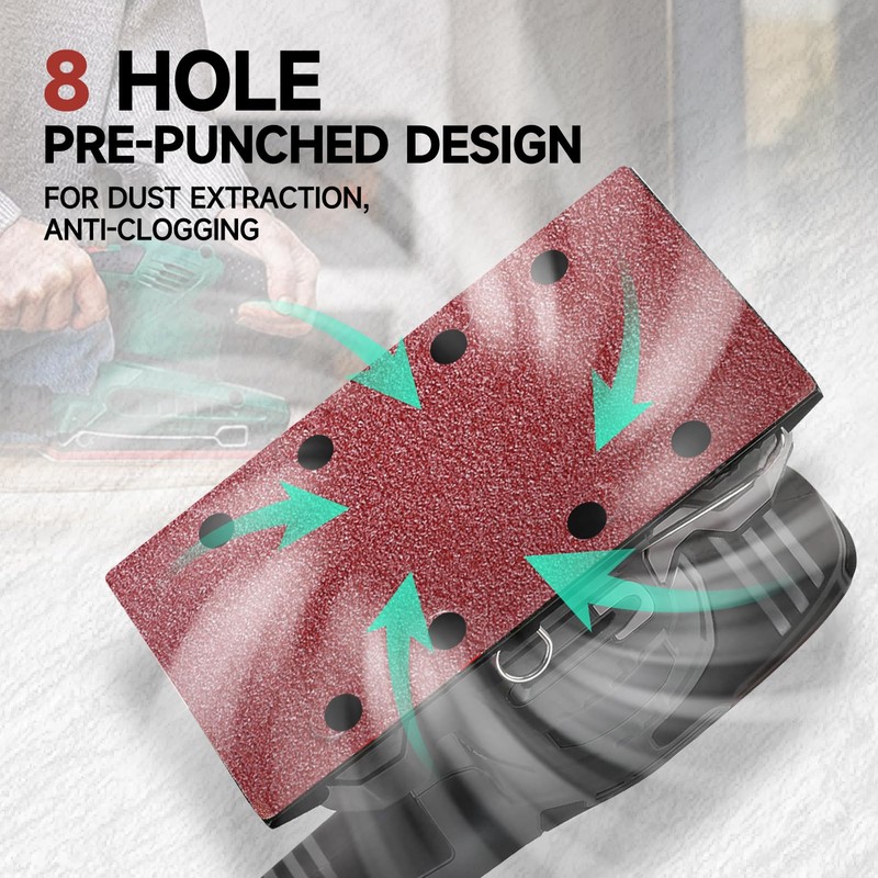 - Velcro strap support and 8-hole design: the Velcro sanding sheets 80 x 133 have a Velcro support with strong adsorption, which can be easily and quickly attached to the sander, not easy to fall off and is easy to disassemble. And there are 8 holes on the sanding pad, which can effectively remove dust and prevent the accumulation of ineffective materials.