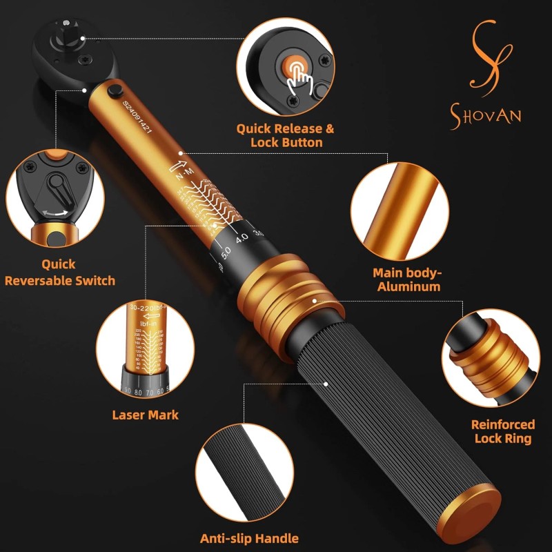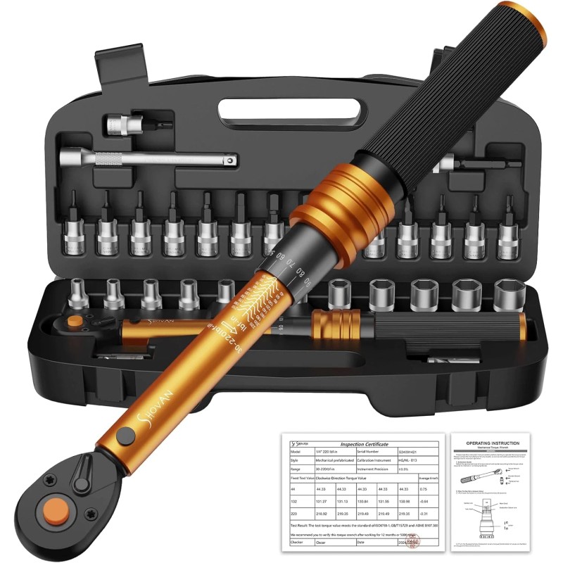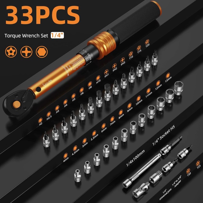 ss shovan Small Torque Wrench Set 33PCS, 1/4" Drive 72-Tooth Click, Dual Scale 30-220 In-L