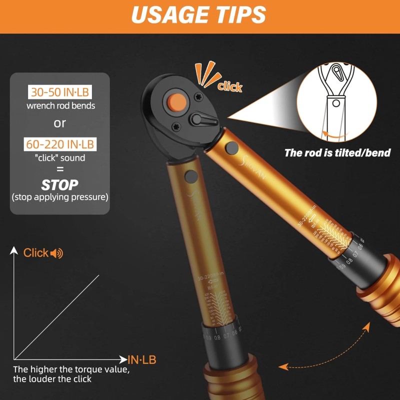 - Easy to Use - Pull down the locking ring to unlock, rotate to set the desired torque, then release to lock. below 50 IN.LB, the rod bends slightly; above 50 IN.LB, it emits a โclickโ when the set torque is reached. The clicking sound will become more obvious as the torque value increases. โ ๐๐ญ๐จ๐ฉ ๐๐ฉ๐ฉ๐ฅ๐ฒ๐ข๐ง๐ ๐๐จ๐ซ๐๐ ๐ข๐ฆ๐ฆ๐๐๐ข๐๐ญ๐๐ฅ๐ฒ ๐จ๐ง๐๐ ๐ญ๐ก๐ ๐ญ๐จ๐ซ๐ช๐ฎ๐ ๐ฏ๐๐ฅ๐ฎ๐ ๐ข๐ฌ ๐ซ๐๐๐๐ก๐๐.