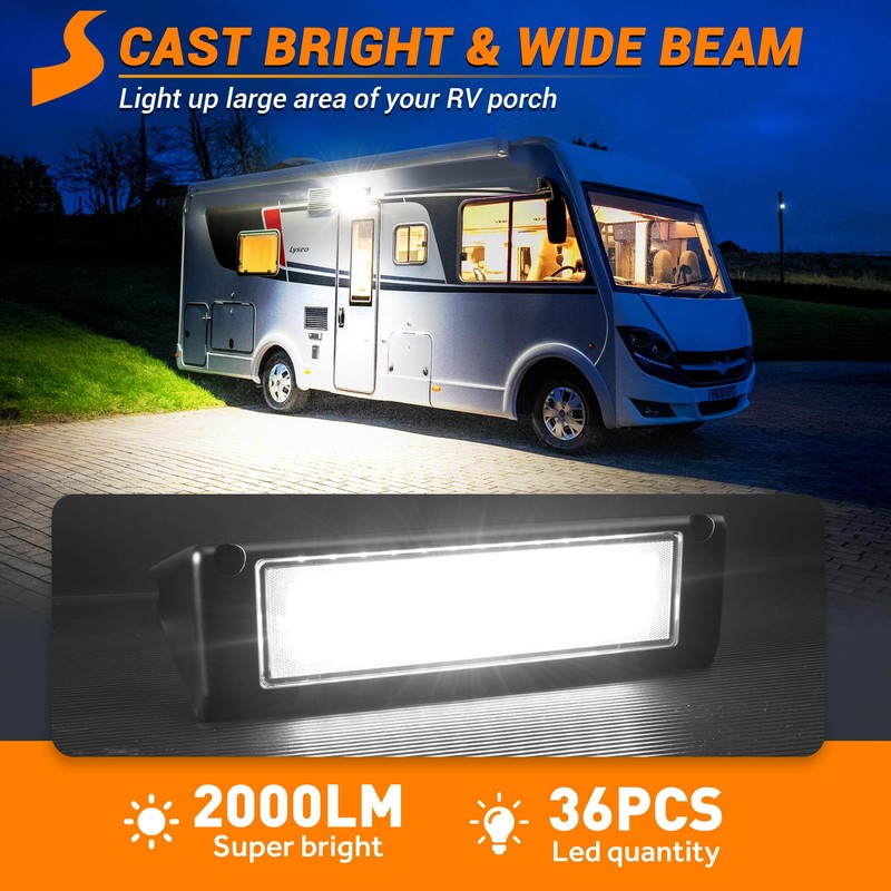 - Exceptional Brightness: 54W output, features 36 high-brightness LEDs, emitting 2000LM in a clear 6000K white light. Anti-glare PC lens ensures comfortable, dazzling-free illumination. The spread irradition range of RV lights exterior are 65 degree in horizontal spread X 69 degree in vertical to avoid falling and injury in the visual blind area, farewell to the darkness