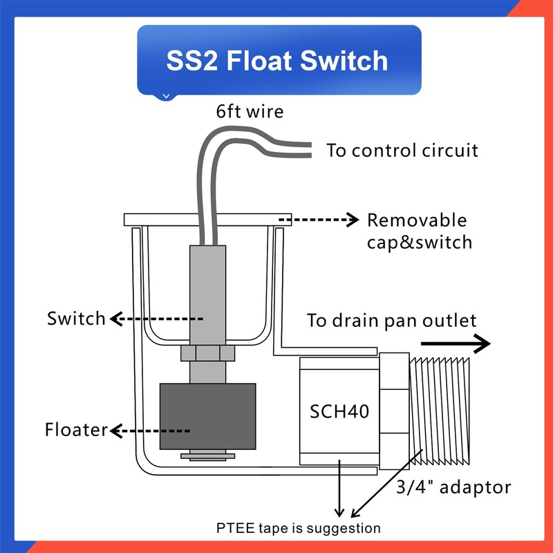 • EASY INSTALLATION - SS2 Float Switch includes 3/4" adapter, busing, cap&switch. it can be installed on the auxiliary drain outlet of primary pan by using the3/4 adaptor, The switch can be connected to either the VCC or thermostat wires. You can use PTEE tape for the adaptor connecting to get high watertight.