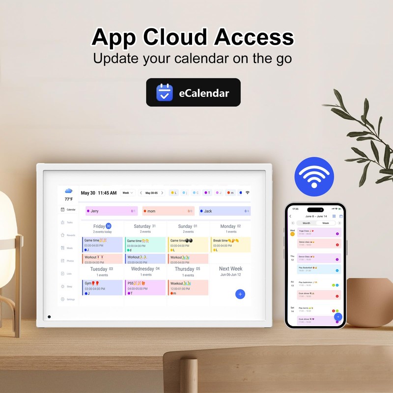 - âïž ăEasy Setup & Multi-Platform Syncă Plug in, connect to Wi-Fi, and go! Effortlessly sync with Google Calendar, iCloud, Outlook, Cozi, and Yahoo. Manage events right on the screen or through a simple app. Includes Auto Updates.