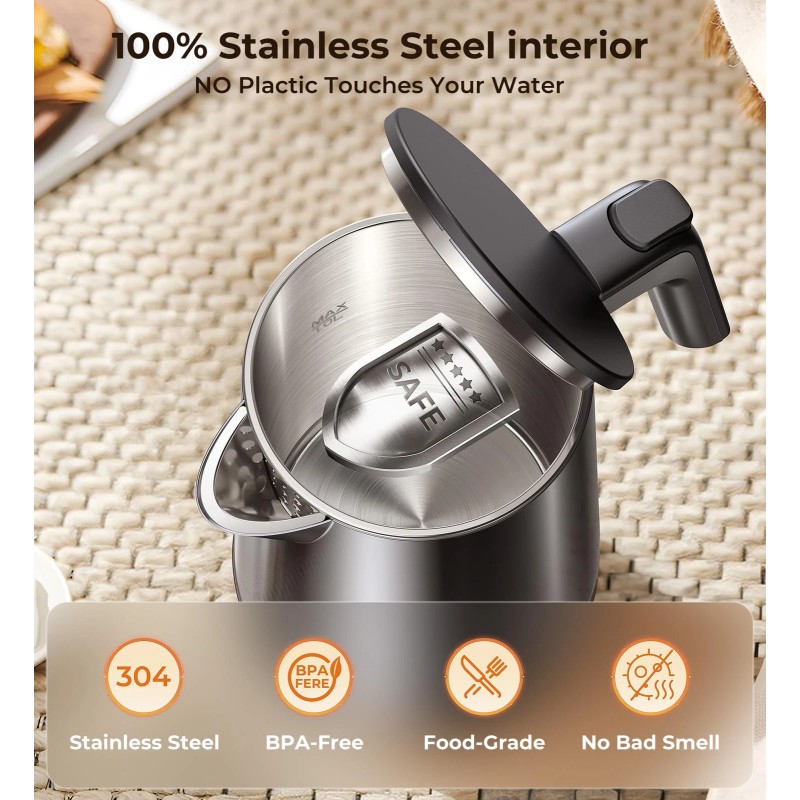 【Cool Touch】With a double-wall design, our electric tea kettle's exterior remains cool to the touch, ensuring worry-free usage and utmost safety.